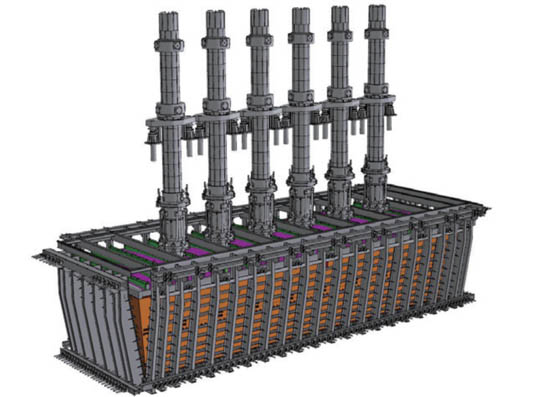 自主開發(fā)的專利產(chǎn)品,由倒梯形爐體結(jié)構(gòu)、整體彈性骨架及電極裝置組成,RKEF火法煉鎳鐵的核心設(shè)備。